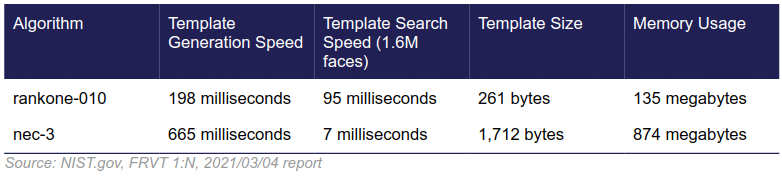 Similarly, the NEC algorithm requires more than 3x the CPU throughput as the ROC algorithm to generate templates for faces encountered in an image or video frame. The total throughput difference to both generate a template and search it against a large-sized gallery is more than 2x different. The memory usage of the Rank One algorithm is an order of magnitude less than NEC.